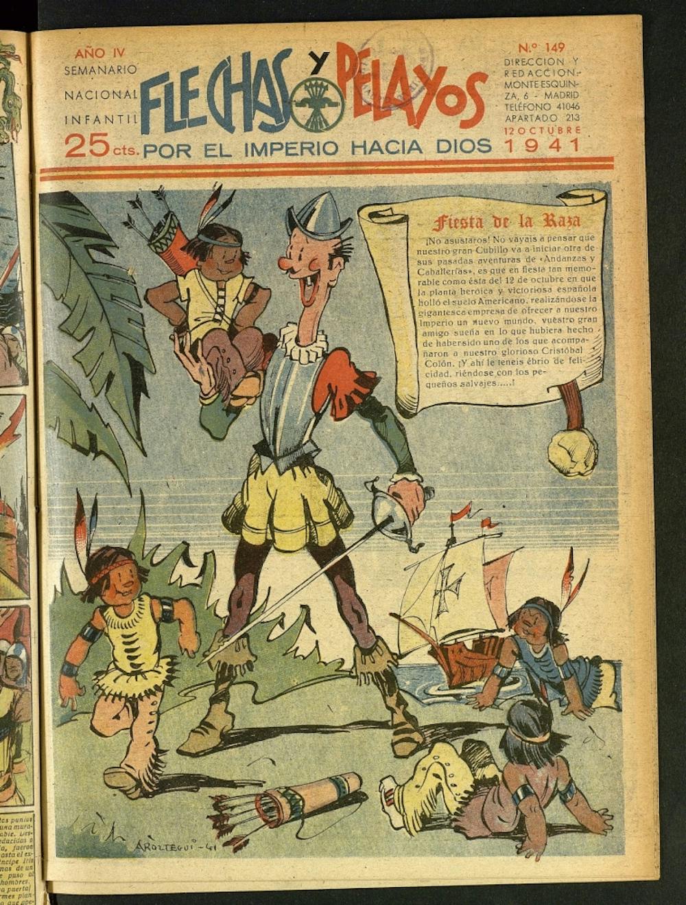 3Debido a que el dictador Miguel Primo de Rivera consideraba el separatismo como una de las mayores amenazas del país, en su primera semana en el poder ordenó la prohibición del uso de la lengua, himno y bandera catalanas en actos oficiales". Bruguera, en una aparente "respuesta a la represión que estaba llevando el nuevo gobierno", "se embarcó en la publicación de 'Signoret' (1924-1928), que además de estar escrita en catalán, también reivindicaba la cultura catalana". Pero en esta época turbulenta, hacer proselitismo, incluso -o sobre todo- en las publicaciones juveniles era el pan de cada día. Como ejemplo, "la agresividad panfletaria de las revistas 'Flechas' (1936-37), de orientación falangista; 'Pelayos' (1936-38), de orientación carlista, o la unión de estas dos, 'Flechas y Pelayos' (1939-49), [...] que exaltaban la violencia y el odio en unas historietas en las que los propios niños iban al frente a matar rojos, separatistas y antiespañoles. Ni en 'TBO' ni en EL Gato Negro llegarían a publicar bocadillos equivalentes a estos: '¿Para qué tendré que estudiar, si para matar rojos, que es lo que yo quiero, no se necesita?' [número 52 de 'Pelayos'] o 'Tengo sed de robar y asesinar. Por algo soy rojo' [número 25 de 'Pelayos']". La respuesta, sin querer, vino con El capitán Trueno, que al principio iba a ser otro cuadernillo del montón, pero el cómic que marcaría la diferencia para Bruguera llegaría a alcanzar los 350.000 ejemplares en un sólo número. Un comunista declarado y un maestro represaliado", Víctor Mora y 'Ambrós', serían los artífices de la magia. La premisa del primer cuadernillo de 1956 no parecía nada del otro mundo: un caballero español luchaba en la cruzada del siglo XII junto a Ricardo Corazón de León para recuperar Palestina: con él viajaban dos leales compañeros, el hambriento [de nuevo] y forzudo Goliath y el adolescente Crispín y, en vez de ponerse solemnes, Mora -que acabó inscrito en el PSUC y exiliado en Francia- y Ambrós decidieron construir un héroe "desenfadado y con sentido del humor, que trataba a sus compañeros no como siervos, sino como iguales"; el personaje carece de un pasado trágico, lo que permite que se produzcan instancias de humor en algunas historietas. Un factor remarcable de estos tebeos es que la mayor parte de los villanos son usurpadores que derrocan al gobierno legítimo y gobiernan sus respectivas tierras con puño de hierro. Con estas credenciales no es sorprendente que no tardara mucho tiempo en convertirse en una víctima predilecta de la censura hasta el punto de que la presión de los censores forzó a la editorial a infantilizar el contenido en detrimento de la calidad de las historietas.